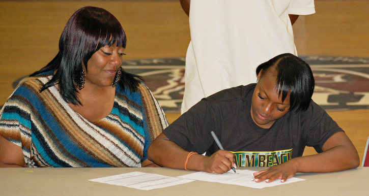 Tate High School senior point guard Jardae Ward has signed a scholarship with Palm Beach State College. She signed her scholarship in the school’s Fryman Gym in front her teammates, ROTC members and classmates. Pictured: Jardae Ward (left) signs her Palm Beach State College scholarship as her mother, Gwendolyn Ward, looks on. Submitted photo for NorthEscambia.com, click to enlarge.