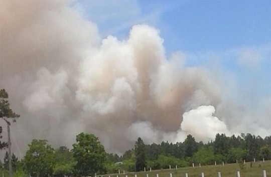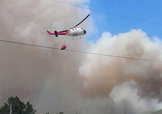 Pictured top: A Florida Forest Service helicopter dropped 300 gallons of water at a time on a wildfire in southwestern Escambia County Saturday afternoon. Pictured below: The fire consumed about 80 acres and forced evacuations of several homes. Reader photos by Kim Spring for NorthEscambia.com, click to enlarge.