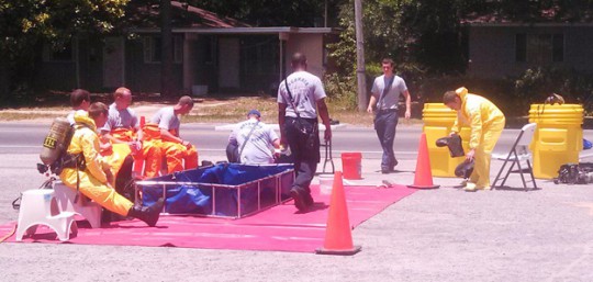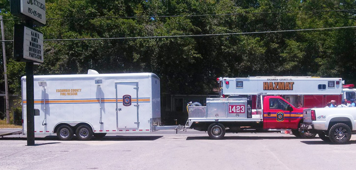 Pictured top: An Escambia County Fire Rescue Hazmat team on scene of a chemical spill Thursday afternoon on Massachusetts Avenue. Pictured below: A decontamination area is set up in the parking of University Auto Recyclers. Reader submitted photos by Edwin Schaff for NorthEscambia.com, click to enlarge.