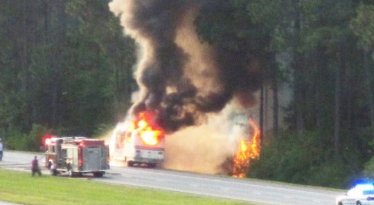 Fire destroyed an RV, shutting down a portion of I-10 Wednesday evening. The westbound lanes of I-10 were closed about a mile west of the Florida Welcome Center in Beulah for about an hour due to the fire. There were no injuries reported. Pictured: An RV burns on I-10 about 6:45 p.m. Reader submitted photos by Lynn Garrett, click to enlarge.