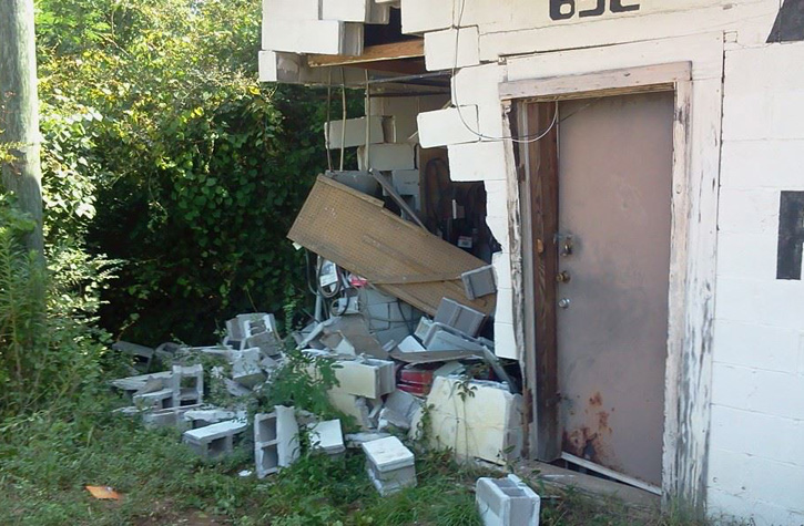 The pickup truck pushed into the corner of the concrete block building causing severe damage to the building and its electrical service panel. The driver was not seriously injured and refused transport to the hospital by EMS.