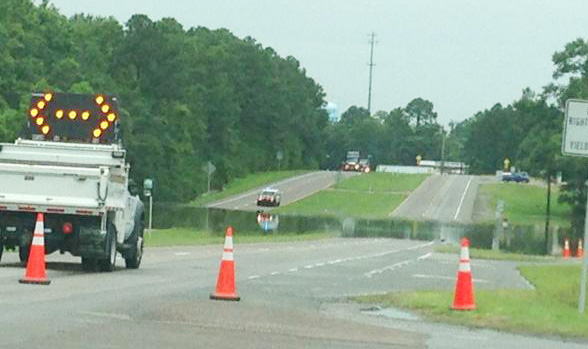 Pictured top: This reader photo by Jamie Boutwell shows water crossing Highway 29 before the roadway was closed. Pictured below: Reader photo by Brandi Ratcliff shows Highway 29 closed at Kingsfield. Submitted photos for NorthEscambia.com, click to enlarge.