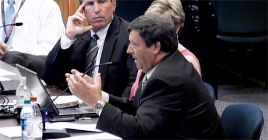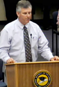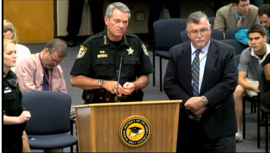 Pictured top: Escambia School Superintendent Malcolm Thomas at a special board workshop Wednesday evening. Pictured top inset: Board Chairman Jeff Bergosh wanted changes to the district’s policy regarding student questioning by law enforcement. Pictured bottom inset: Tate High Principal Rick Shackle. Pictured below: Escambia County Sheriff David Morgan addresses the Escambia County School Board. Courtesy images for NorthEscambia.com, click to enlarge.