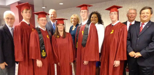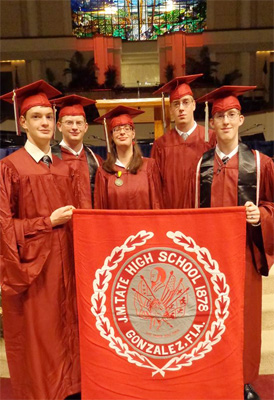 Pictured top: The Baker quintuplets — (L-R) Ian Kirk, Marcus Wade, Elizabeth Jane, Tristan Miller and Evan Whitson — with mom Mona Baker at Tate High School’s graduation. Pictured below: The five siblings pose at the Pensacola Bay Center with the five members of the Escambia County School Board and Superintendent Malcolm Thomas. Pictured inset: The quintuplets at a Baccalaureate service at Olive Baptist Church. Submitted photos for NorthEscambia.com, click to enlarge.