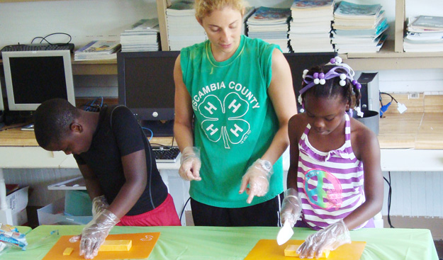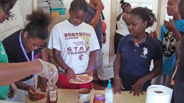 Above: Jamie Spiker taught knife handling skills and had the youth practice on cheese that they later used as a snack with whole wheat crackers.