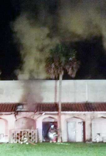 Pictured: A fire burns on the outside of the Hadji Shrine Temple building on Nine Mile Road early Saturday morning. NorthEscambia.com photos by Kristi Smith, click to enlarge.