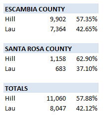 Hill collected nearly 58 percent of the vote, while Democrat Jeremy Lau, a labor-union leader, received about 42 percent. The special election in House District 2, which includes voters in Escambia and Santa Rosa counties, came nearly three months after Ford, a Gulf Breeze Republican, died of cancer.