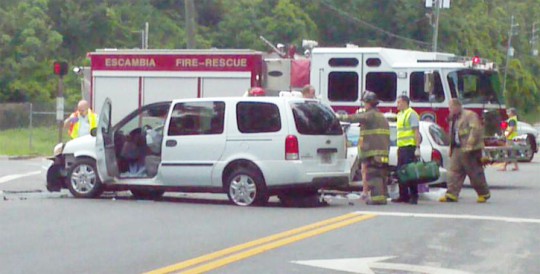 Two people were seriously injured in a wreck about 3:45 Friday afternoon at the intersection of Scenic Highway and East Olive Road. Two people involved in the crash were transported by Escambia County EMS as “trauma alerts”. The accident remains under investigation by the Florida Highway Patrol. Further details have not been released. Submitted photo by Doug Fortune for NorthEscambia.com, click to enlarge.