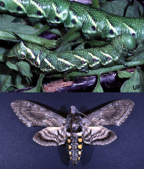 The adult moth is large with mottled brown forewings that are longer than the lighter brown hind wings. The sides of the abdomen have five yellow spots on the sides. The female moth will lay eggs on the upper and lower surfaces of leaves. The adult moths are nectar feeders on many flowers and may be seen in the early evening around gardens and flowers.