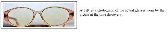 The victim is a white female; 50 to 70 years of age, 5’2” to 5’9” tall, heavy build, with red or auburn colored hair that was tied with a red scrunchy. There is a tattoo of “Jane” on the left shoulder blade, and the victim was wearing a light colored floral design shirt, size 3XL, grey colored sweatpants, size 36-38, and white Danskins tennis shoes, size 10W. The victim had no teeth, and wore pink and grey colored glasses.