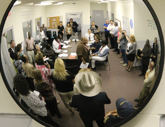 Pictured top and bottom: A diverse group of community members and governmental representatives toured Century Correctional Institution Thursday morning. Pictured inset: The group is seen via a security mirror. Pictured below: Warden John Whitehurst explains a prison dorm to group members. NorthEscambia.com photos, click to enlarge.