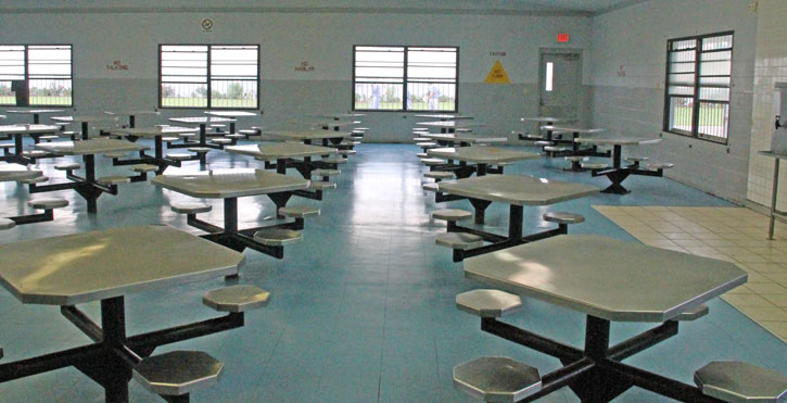 The facility serves 1,400 inmates in about an hour and a half, including service for medical special diet prisoners at the beginning or end of a food shift. The noise at a meal is best described as a low murmur — inmates are allowed only to talk to one of the three others at their table. There’s no conversation or food sharing with neighboring tables.
