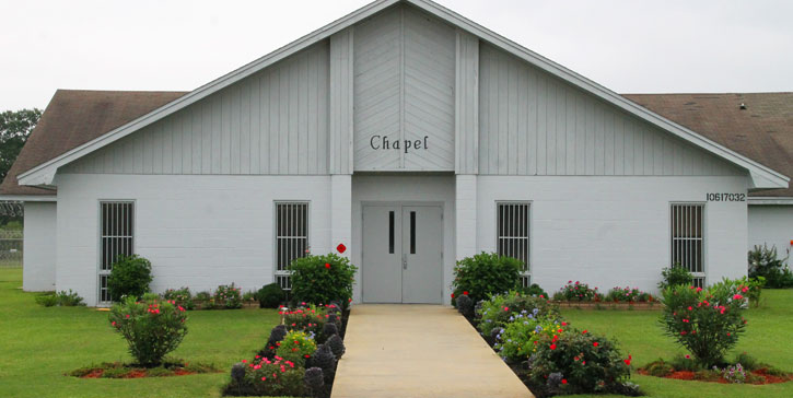 The chapel is as nondescript as the other buildings in the compound. Unlike most churches when viewed from the outside, there’s nothing ornate and no religious symbols. Just a simple “Chapel” over the door and the number “10617032″ in one corner — the state’s building number.