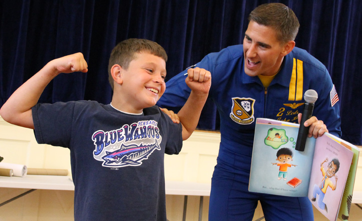 Pictured top: LCDR John Hiltz,, pilot of the No. 2 Blue Angels plane, gets a little help with a story that pointed out humans have arms, not wings during a storytime earlier this year at the Molino Branch Library. NorthEscambia.com file photo, click to enlarge.