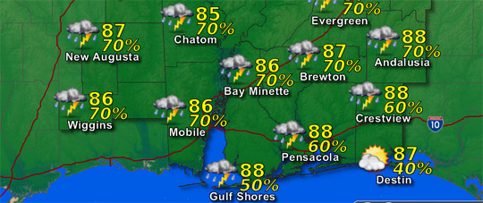 - Tonight: Showers and thunderstorms likely, mainly before 1am. Mostly cloudy, with a low around 72. South wind around 5 mph. Chance of precipitation is 60%.
