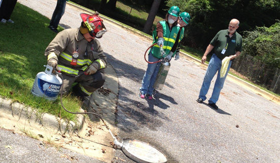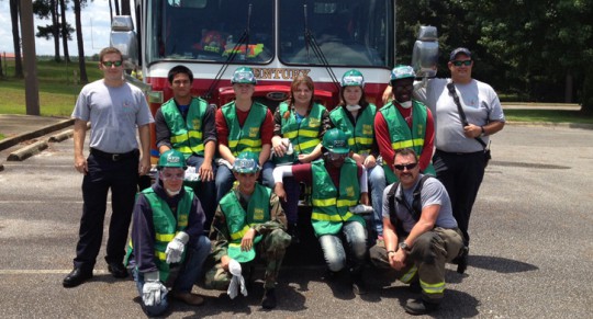 Pictured top: Northview Teen CERT members Elijah Harbison, Sean Allister, Donald Baity, Lane Carnley, Zacarra Davis, Dylan Cartwright, Kira Cartwright, and Shauna Walker. Pictured below: Teen CERT members learned basic firefighting techniques Thursday afternoon from the crew of Escambia County Fire Rescue Engine 519 from Century. Pictured inset: The teens practice moving an “injured” person using a chair. Photos for NorthEscambia.com, click to enlarge.