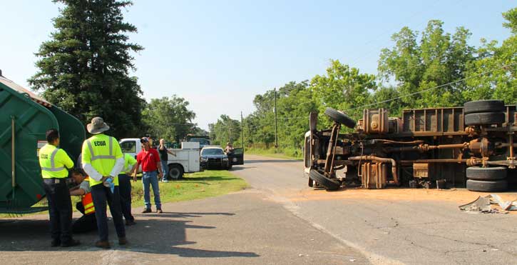The ECUA sanitation truck driven by 52-year old Jeffrey B. Mathis of Pensacola was stopped on southbound Highway 95A to pick up trash and then moved forward to make a left turn onto Kemala Avenue, according to the Florida Highway Patrol. The rear corner of the sanitation truck was hit by a southbound dump truck driven by 53-year old Sammy E. Fuller of Molino, causing the dump truck to overturn.