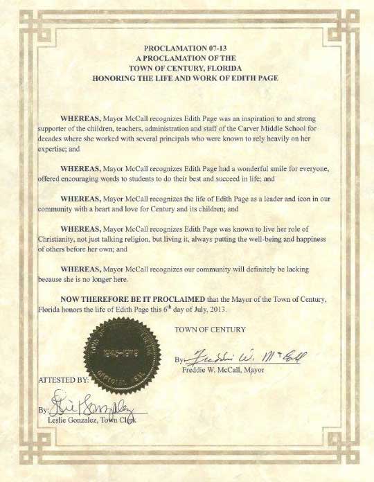 The Town of Century has issued a proclamation honoring the life of Edith Joyce Page, a longtime school secretary that passed away on June 30.