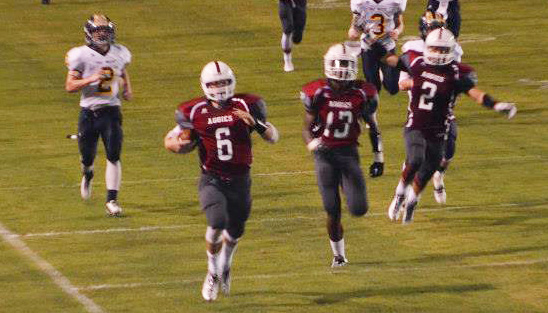 Pictured: Tate High School’s preseason opener against Gulf Breeze ended with varsity and JV wins for the Aggies. Top photo: Tate quarterback Sawyer Smith returns an interception for a 60-yard touchdown. Photos by Kristi Smith for NorthEscambia.com, click to enlarge.