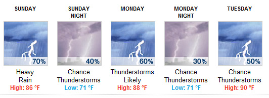 - Sunday: Showers and thunderstorms likely. Some of the storms could produce heavy rain. Mostly cloudy, with a high near 86. Southeast wind around 10 mph. Chance of precipitation is 70%.