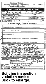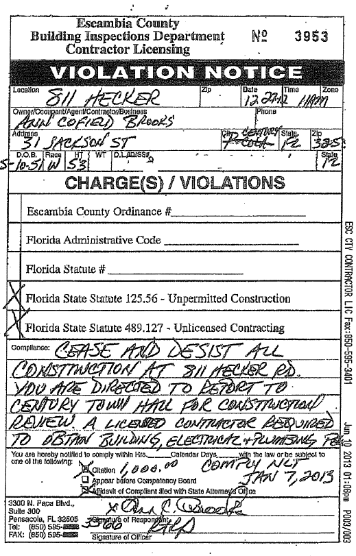 On December 27, 2012 the Escambia County Building Inspections Department issued a violation notice to Brooks ordering her to “cease and desist” all construction work at her 811 Hecker Road rental property. She was directed to report to the Century Town Hall for a construction review.