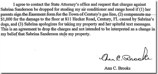 In a letter dated May 9, 2013, Brooks indicated that she would drop the criminal charges against Sabrina Sanderson for stealing her air conditioner and range hood if three conditions were met: (1) her parents signed a utility easement for a Town of Century gas line (2) a $1,000 payment for damage to the floor in the Hecker Street rental home, and (3) Sabrina Sanderson would make an apology for “taking my property and her spiteful text messages”.