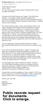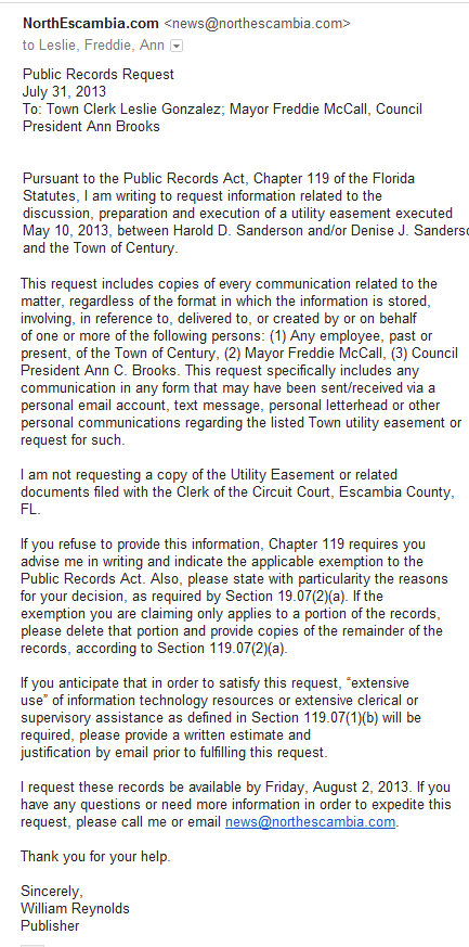 As part of our investigation into the claims, NorthEscambia.com also made an official written public records request July 31 to the Town of Century for any documents related to the utility/gas easement between the Town of Century and Harold or Denise Sanderson, with the exception of documents (including the actual easement) on file with the Escambia County Circuit Clerk The request was sent to the Town of Century official email addresses belonging to Mayor Freddie McCall, Town Clerk Leslie Gonzalez and Council President Ann Brooks with a request to reply by August 2.