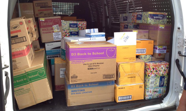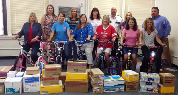 Pictured: Century Correctional Institution and partners delivered bicycles and school supplies Wednesday to (top) Byrneville Elementary, (inset) Bratt Elementary, and (below) Camp Fire USA in Century and Jay Elementary. Pictured bottom: School supplies loaded up in a CCI van ready for delivery. Submitted photos for NorthEscambia.com, click to enlarge.