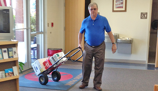Pictured top: Rev. Alan Gantzhorn wheels paper donations from Aldersgate United Methodist Church into Molino Park Elementary School Thursday. Submitted photo for NorthEscambia.com, click to enlarge.