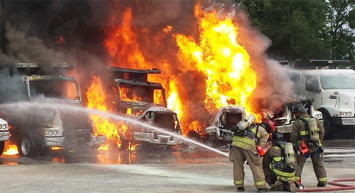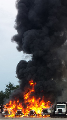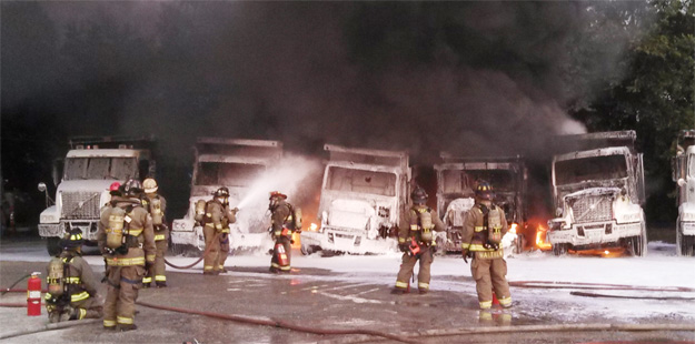 Over a dozen dump trucks were parked in a row in a lot at the Roads, Inc. headquarters on Stone Boulevard, just off Highway 29. Four of the trucks were totally destroyed by the fire, while others were damaged.