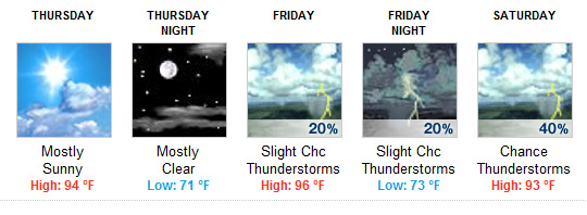 - Sunday: A 40 percent chance of showers and thunderstorms. Partly sunny, with a high near 93. Southwest wind around 5 mph.
