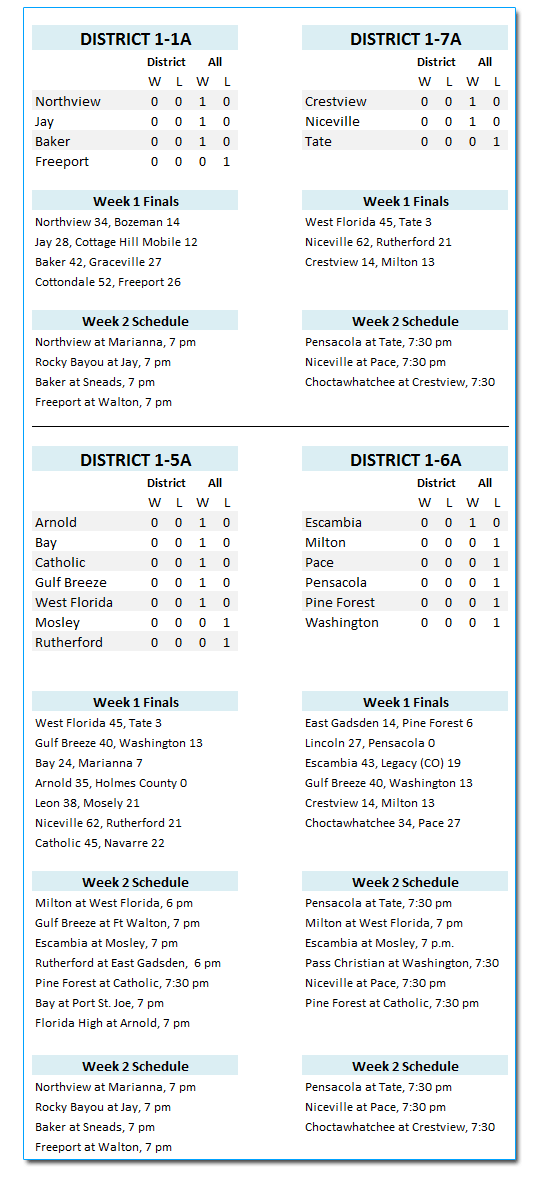 Here is a district by district look at last Friday night’s high school football scores and this week’s schedule. District play has not yet started, so there are no district rankings.