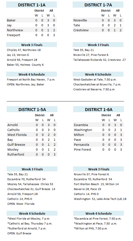 Here is a district by district look at last Friday night’s high school football scores and this week’s schedule. District play begins this Friday night for 5A and 6A teams, while 1A and 7A teams in the area either have an off week or will not play district games.