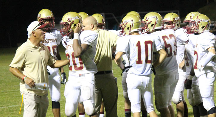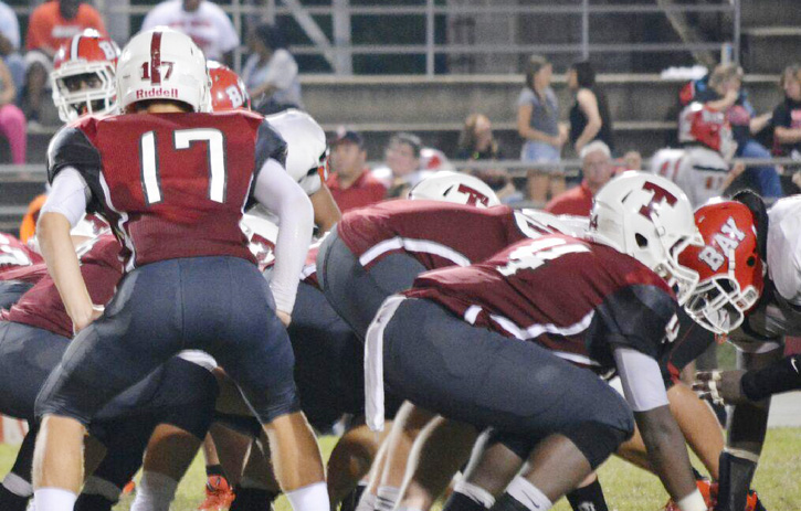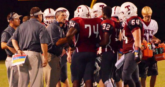 Pictured above: Tate beat Panama City Bay Friday night in Cantonment. Pictured below: Coach Ronnie Douglas huddles with the team between plays. Photos by Kaleigh Blackmon and Kristi Smith for NorthEscambia.com, click to enlarge.