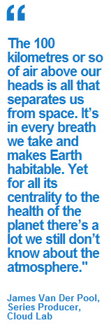 Cloud Lab series producer, James Van Der Pool, explains: “The 100 kilometers or so of air above our heads is all that separates us from space. It’s in every breath we take and makes Earth habitable. Yet for all its centrality to the health of the planet there’s a lot we still don’t know about the atmosphere. For instance, at what altitude does life cease? What type of air is most likely to cause rain? With Cloud Lab we’ve a rare and exciting opportunity to address some of these questions head on.”