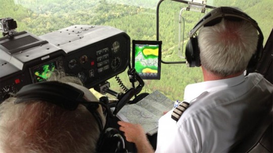 Pictured top: The Cloud Lab blimp, the world’s largest airship, over Pensacola Thursday, reader photo by Kevin Winingar for NorthEscambia.com). Pictured below: Cloud Lab pilots watch the weather radar on the map (next to the dashboard) as they travel over the Florida Panhandle Thursday, photo courtesy BBC for NorthEscambia.com, click to enlarge.