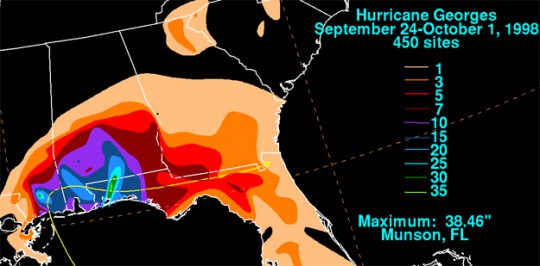 Georges brought torrential rainfall to the Gulf Coast, with Pensacola receiving 26.83 inches of rain, Bay Minette 29.66 inches and Munson 38.46 inches. Numerous other locations received between one and two feet of rain.