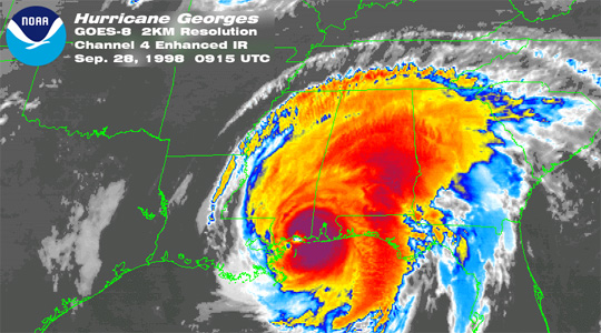 Hurricane Georges made landfall near Biloxi 15 years ago on the morning on September 28, 1998, with maximum winds of 110 mph. Georges moved very slowly across southern Mississippi and weakened to a tropical depression by the morning of the 29th when the center was about 30 miles north northeast of Mobile. The storm dissipated near the northeast Florida/southeast Georgia coast by the morning of October 1, 1998.
