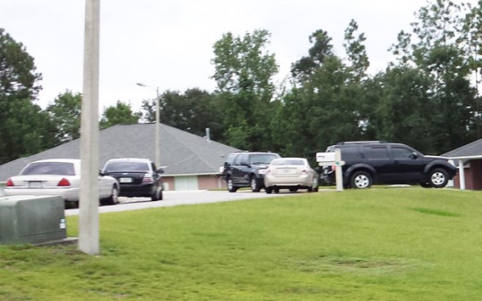 Pictured top and bottom: Law enforcement executes a search warrant in Cantonment Tuesday. The suspect’s address, 806 Chesapeake Trail, is the house to the far right (foreground) of the bottom picture. Reader submitted photos for NorthEscambia.com, click to enlarge.