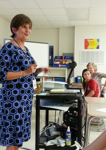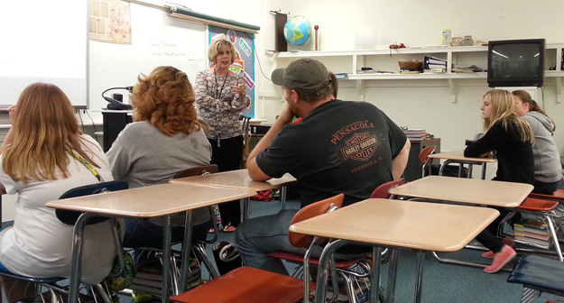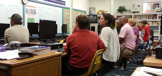 Pictured top: Ernest Ward Middle School teacher Laura Chavers explains her class to parents Tuesday night. Pictured inset: EWMS teacher Renee Wilkins discusses her language arts class with parents. Pictured Parents at Tuesday night’s Open House at Ernest Ward Middle School. NorthEscambia.com photos, click to enlarge.