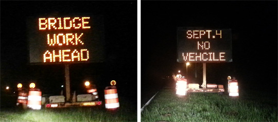 Does spelling count in bridge work? Several readers pointed out the “BIDGE” and “VEHIKLE” spelling errors to us Wednesday on electronic warning signs near a bridge undergoing work this week on Arthur Brown Road (above). We went by Wednesday night to see for ourselves, and we found the word “bridge” had been corrected. An attempt was made to correct the word “VEHIKLE”, but they still just didn’t get it quite right.
