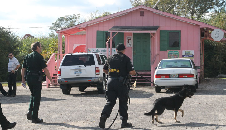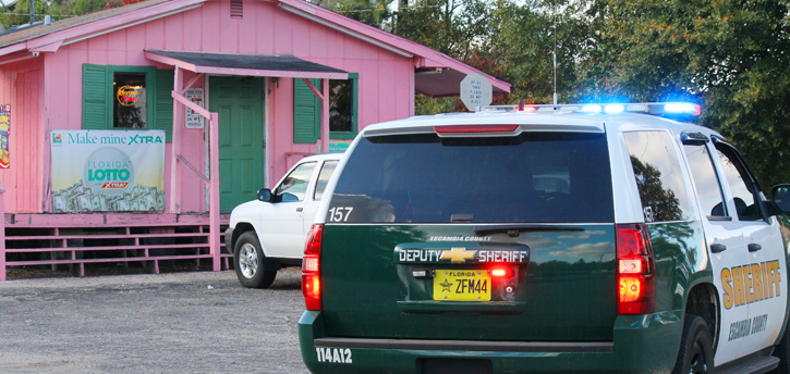 Pictured top and bottom: The scene outside the State Line O’ Yes Lotto on Highway 97 following the murder of store owner Thomas Kroll on November 6, 2012. NorthEscambia.com file photos, click to enlarge.
