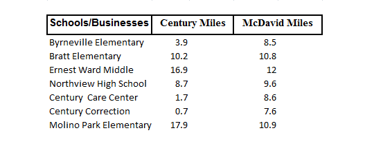 However, NorthEscambia.com discovered some of the listed data presented by McCall was erroneous. Century’s data shows the distance from the McDavid Fire Station to Ernest Ward Middle School at 17.72 miles; however, the actual distance is only 12 miles. Century’s data also overstated the mileage from McDavid to Northview High School by 3.81 miles, and from McDavid to Bratt Elementary School by an extra 4.8 miles. (See charts at bottom of article.)