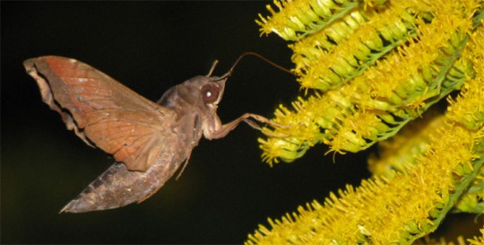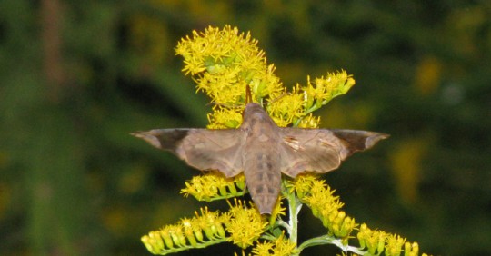 Sheila Bryan first thought hummingbirds were visiting the goldenrods blooming in her backyard, but with a closer look discovered she was actually looking at hummingbird moths. The moth has a hovering behavior and an audible humming noise which makes it look remarkably like a hummingbird while it is feeding on flowers. Submitted photos by Sheila Bryan for NorthEscambia.com, click to enlarge.