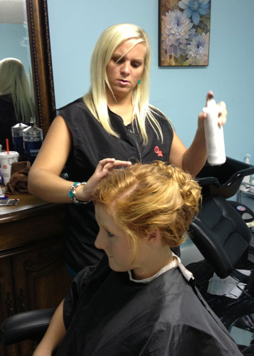 Pictured top: A grand opening ribbon cutting Thursday at Shelia’s Styles of the Century. Picture inset: Stylist Brandy Gafford and customer Megan Bryan. Courtesy photos for NorthEscambia.com, click to enlarge.