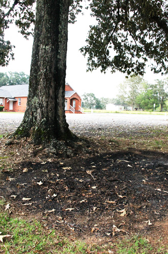 The lightning hit an oak tree at the Molino Assembly of God at 3436 Molino Road. A small portion of the tree caught fire after the strike, along with an area under the tree. There was no other property damage and no injuries reported.