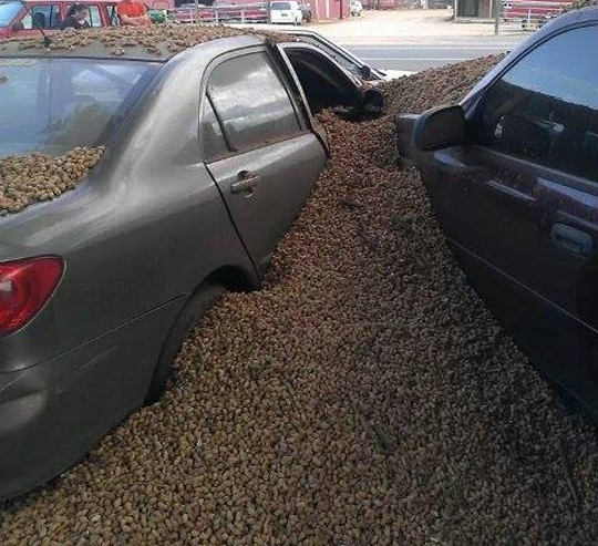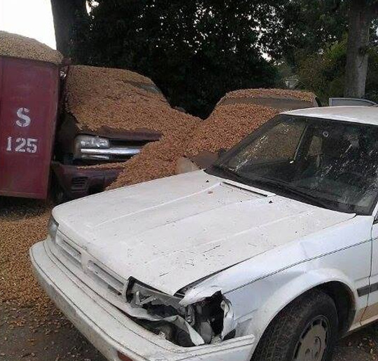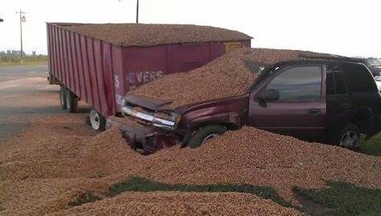 We saw this while en route from the Jay peanut festival to our Allentown home.Saw people standing around talking about it.Guess they were blaming each other .lol.Would hate to explain to the insurance company that peanuts totalled my car!!!!