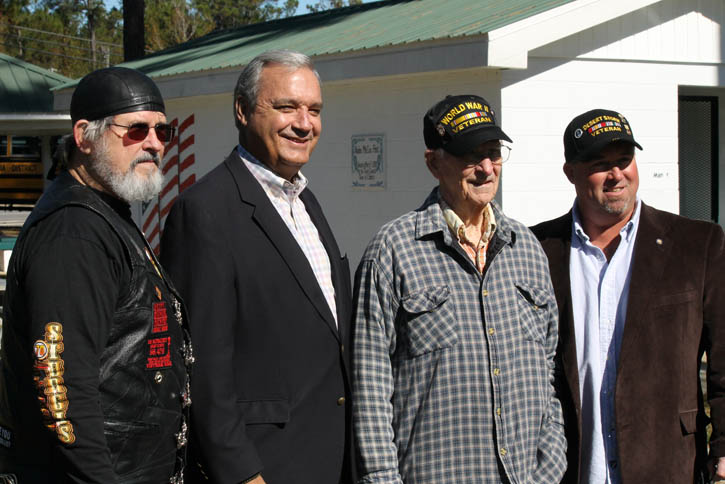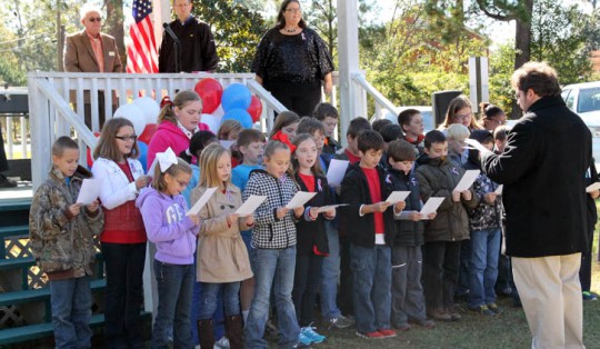 Pictured top: Fourth and fifth graders of the Byrneville Elementary School Chorus perform at Century’s Veterans Celebration. Pictured inset: Northview High School graduate Chad Smith speaks to veterans. Pictured below: Congressman Jeff Miller poses for a photo with veterans in Century. NorthEscambia.com photos, click to enlarge.