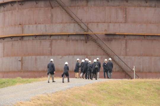 Pictured: Steve Perrigin, Genesis operations manager, explains how crude oil flows through the Walnut Hill Rail Facility Thursday. Pictured top inset: Crude oil is offloaded from trains and injected into a pipeline to Gulf Coast refineries at the facility. Pictured bottom inset: Perrigin explains the facility can be controlled on-site or remotely from Houston. Pictured below: Visitors are dwarfed by a second 100,000 barrel oil storage tank under construction at the facility. NorthEscambia.com photos, click to enlarge.