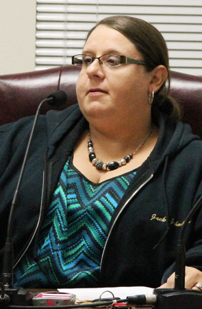 Pictured top: Century council members Ann Brooks (right) and Sandra McMurray Jackson (middle) listen to council member Jacke Johnston Monday night. Pictured inset: Johnston explains her views on barnyard animals. NorthEscambia.com photos, click to enlarge.